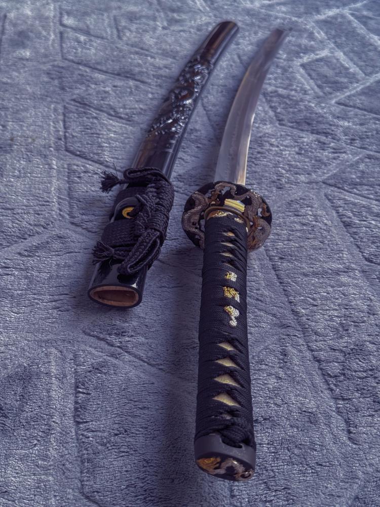 سيف يليق بالملوك — تلتف حول قبضته تسوبا فاخرة مطلية بالذهب والفضة، نقشَت عليها تفاصيل دقيقة تُجسد مزيجًا من الفخامة والقوة. لمعان المعادن النفيسة لا يعكس الضوء فحسب، بل يعكس هيبة كل من يمسك بهذا السيف. تصميمه مستوحى من التراث العريق، لكنه يروي قصة ترف لا يضاهى، وكأن كل جزء فيه صُنع ليكون تحفة.