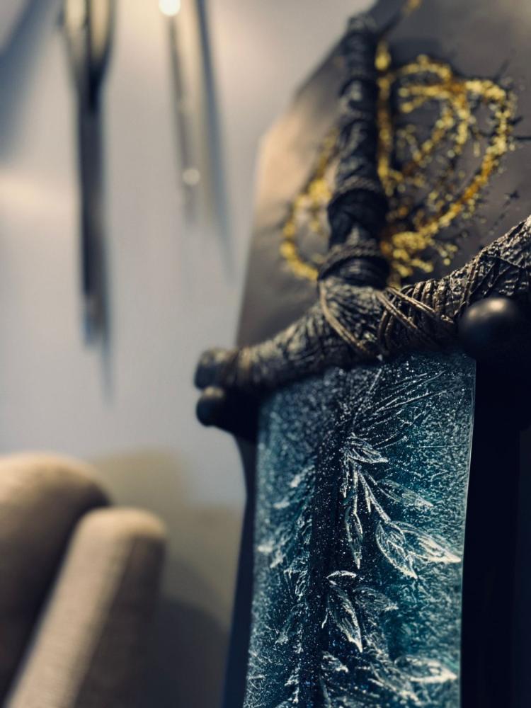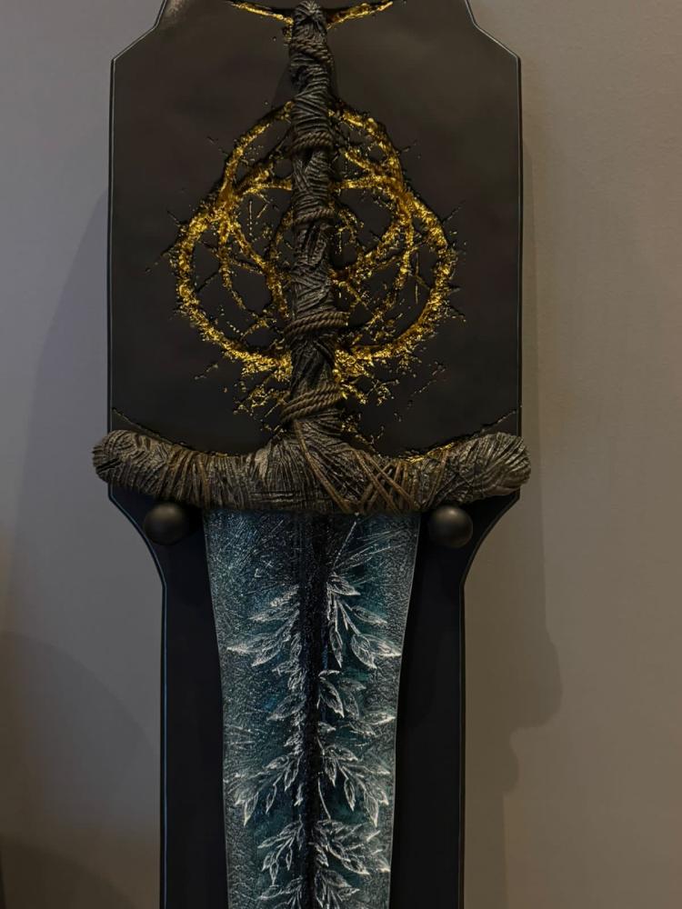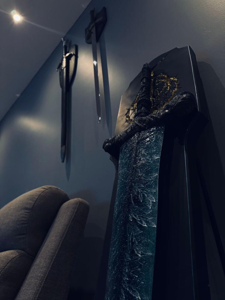 Materials: This sword is entirely crafted from high-quality fiberglass resin, known for its superior durability and meticulous detailing. This material is used in professional modeling and film production, rendering every curve and detail of the sword with stunning realism and a refined artistic touch.